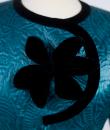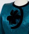 Beautiful Pierre Cardin’s turquoise cloque satin suit jacket (attributed to) dating from the 1980s. Presumed and oral origin of the wardrobe of Madame Jacqueline de Ribes which was celebrated in New York at the MET in 2016 with the exhibition " Art of Style ". Structured jacket hugging the bust and highlighted with a velvet bias on the curved pockets and crew neck A large metal-framed velvet flower adorns the assymetric cut chest. Matching green satin lining and zip fastening marked with P of Pierre Cardin which allows this jacket to be attributed to the French designer. Very beautiful Haute Couture finish by hand.. Without branding and small shoulder pads. No defect. Excellent condition of color and conservation.