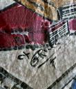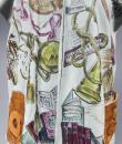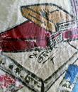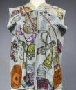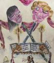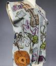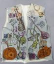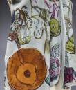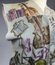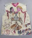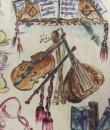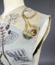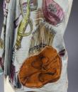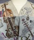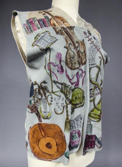 Light blue and beige suede sleeveless waistcoat entirely hand-painted on a musical theme probably signed by René Gruau. Commissioned for a play in the late 1940s. Two brown suede pockets on the front represent the body of a violin and a drum. Non-repetitive motifs painted on the suede relate to traditional music: lyre, piano, violin, lute, trumpet, flute, etc. as well as objects relating to musical representation: books, scores, music stands, musical notes, etc. On the back of the waistcoat are two faces, one happy and one sad, reminiscent of theatre with its two symbolic masks. Excellent colour and condition.