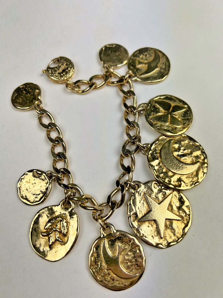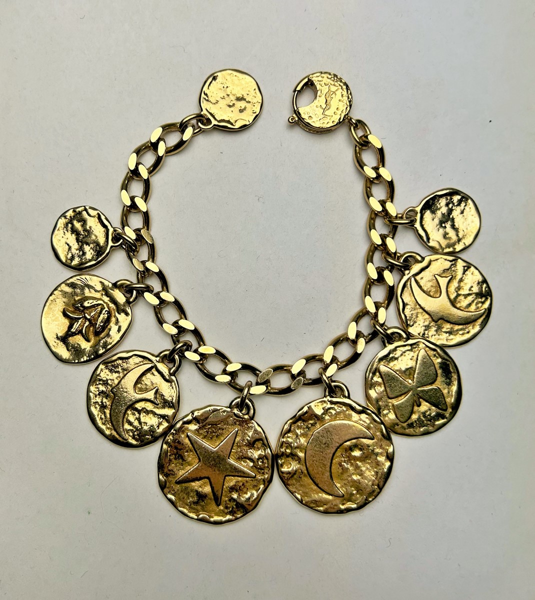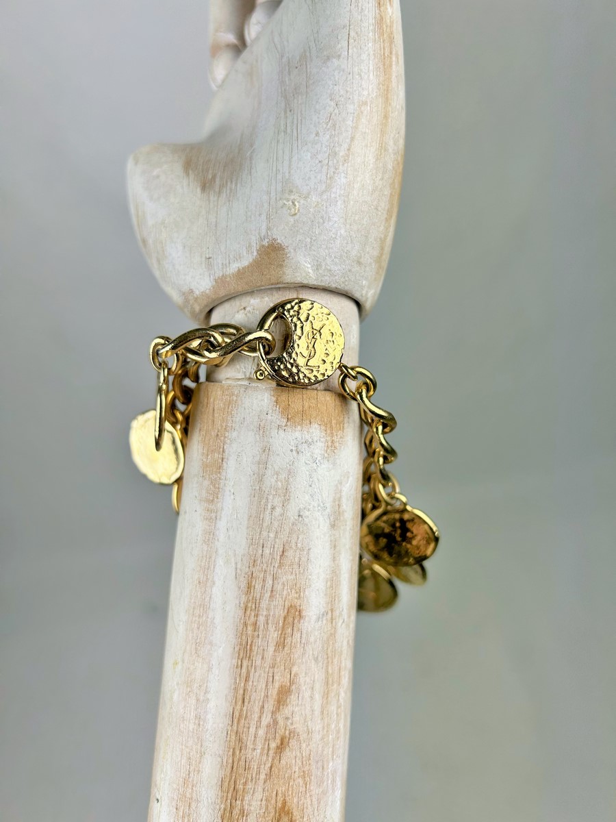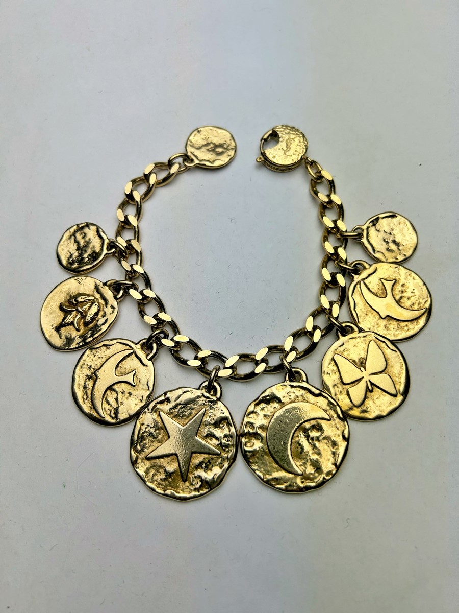Iconic Couture bracelet in ‘crinkled’ gold-plated metal, designed by Robert Goossens for Yves Saint Laurent Couture and dating from the 1990s. This bracelet matches a necklace from the same collection, which is being sold separately. A chain with original links and clasp features the YSL logo, and several embossed medallions are engraved with Yves Saint Laurent's iconic symbols, including stars, butterflies, moons, swallows and fleurs-de-lis from the House of France, which adorned the famous greeting cards designed by the artist in the 1980s. This rare bracelet has retained its original shine and golden sparkle! Good overall condition in terms of colour and preservation. The matching necklace is being sold separately from this bracelet.