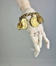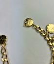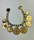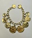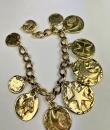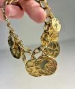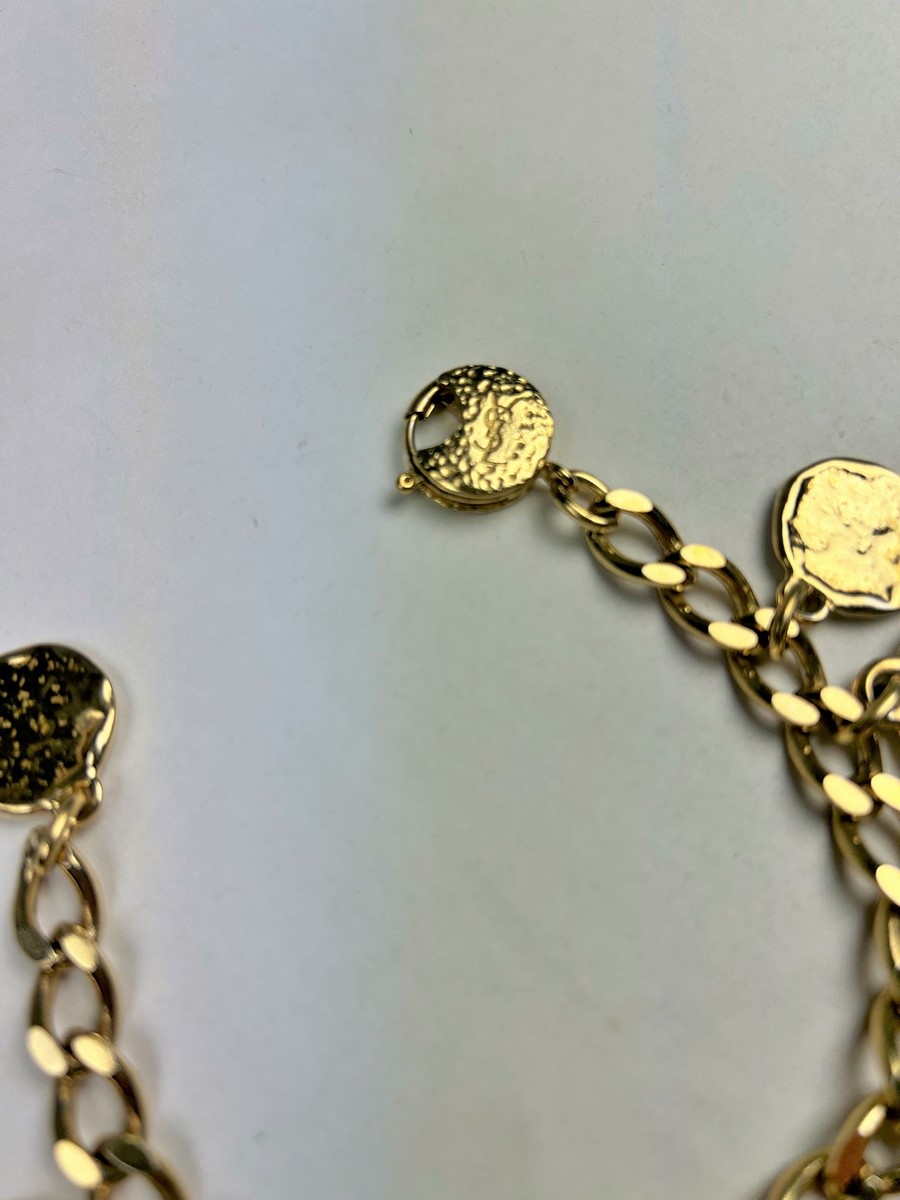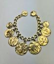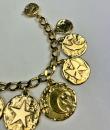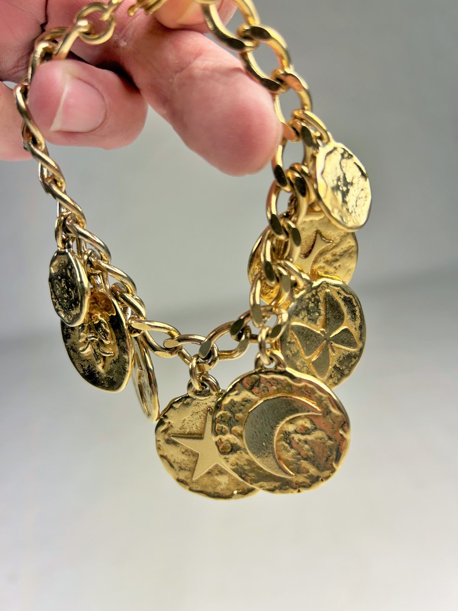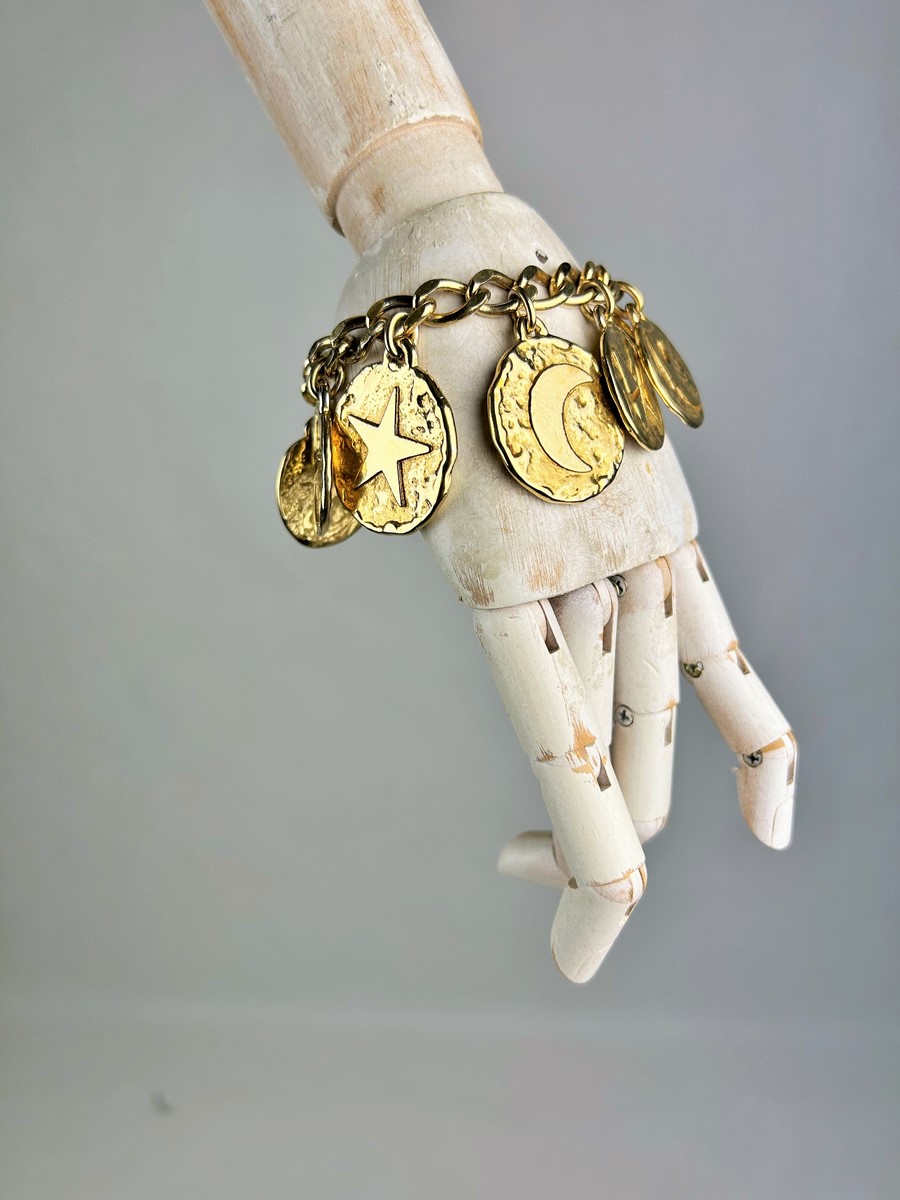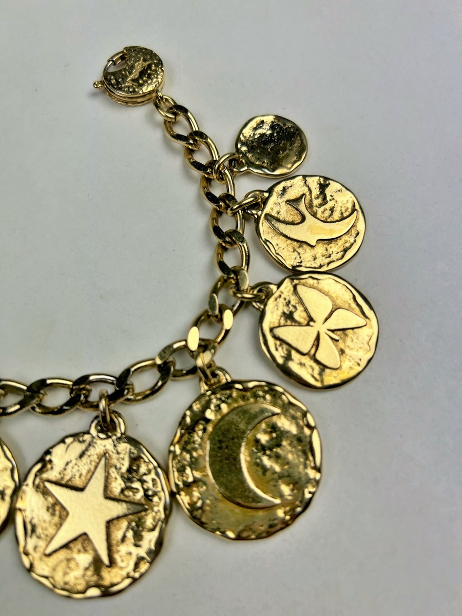 Iconic Couture bracelet in ‘crinkled’ gold-plated metal, designed by Robert Goossens for Yves Saint Laurent Couture and dating from the 1990s. This bracelet matches a necklace from the same collection, which is being sold separately. A chain with original links and clasp features the YSL logo, and several embossed medallions are engraved with Yves Saint Laurent's iconic symbols, including stars, butterflies, moons, swallows and fleurs-de-lis from the House of France, which adorned the famous greeting cards designed by the artist in the 1980s. This rare bracelet has retained its original shine and golden sparkle! Good overall condition in terms of colour and preservation. The matching necklace is being sold separately from this bracelet.
