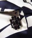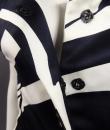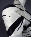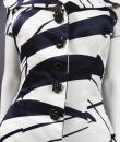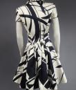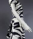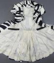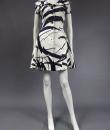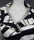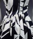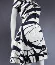 Ted Lapidus dress in thick printed silk satin. Artistic graphic of black lines on a white background, imitating thin and large brush strokes. Closes with five black Swarovski (?) Crystal jewelery buttons concealing snaps. Waisted waist, marked on the back by a set of folds, like a faux-cul dress on the waist. Flat folds on the front of the skirt. Exaggerated shirt collar on small sleeves. White label and golden graphics LAPIDUS HAUTE COUTURE PARIS. Size 36. Very good condition.