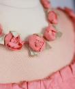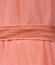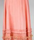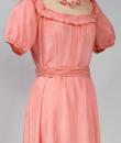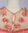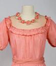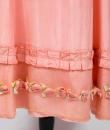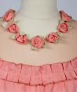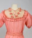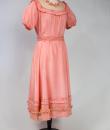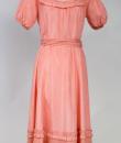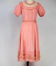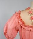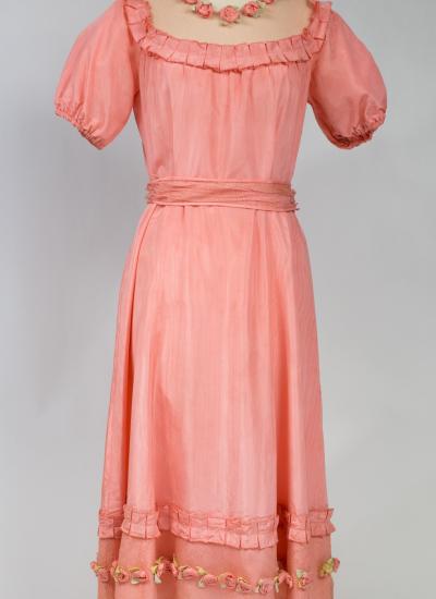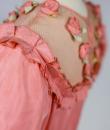 Pretty summer dress in pink rayon decorated with roses dating from the years 1920/1930. Pleated bustier with small puffed sleeves and bateau neckline with cotton mesh neckline adorned with roses. Falbalas pleated in pink rayon on the neckline with a reminder at the bottom of the skirt with a mesh flounce and roses in buttons. Snap fastener on the left side and small belt in matching cotton mesh. No lining. Note two small snags in the bottom net (less than 1 cm) and one missing rose. Otherwise clean dress, no stains and excellent structural condition.