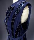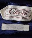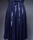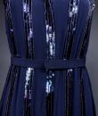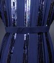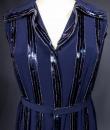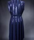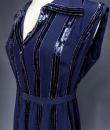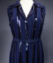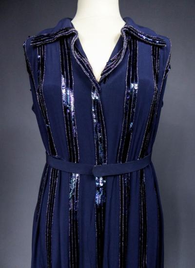 Worth cocktail dress in navy blue silk-crepe with horizontal stripes embroidered with iridescent navy glitter and translucent beads, from the last period of the famous house. Straight sleeveless cut, V-neck with large embroidered cuffs with sequins that join the stripes. Closure of the dress at the front with hooks at the bustier. Midnight blue Duchesse silk satin underdress, zip closure at the back. Discreet matching belt lined with navy leather and closed in front by a concealed hook. Label white background brown graphic Worth 50, Grosvenor Street, handwritten inscription Mr Chealer. This rare model is an example of the production of the English branch which officiates after the closure in 1956 in Paris of the Paquin Worth House. Woth Grosvenor Street in London definitely closed in London in 1967. Very good condition of color and conservation.