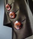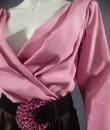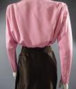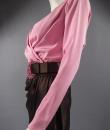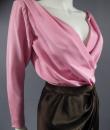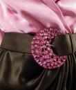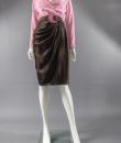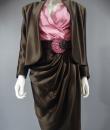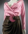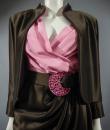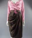 Haute Couture Luxury evening set, Haute Couture skirt, blouse, jacket and belt numbered 65123 from the Yves Saint Laurent 1989 Collection. The low-cut neckline blouse with wide shoulder pads in pink silk crepe is crossed at the front by snaps. Pink crepe reminder for the lining of the jacket. Brown silk satin wrap skirt that closes with snaps. Matching jacket with a raised collar and large pink rhinestone buttons from Swarovski. Large brown satin belt and matching pink rhinestone / crescent rhinestone buckle. Excellent condition of color and conservation.