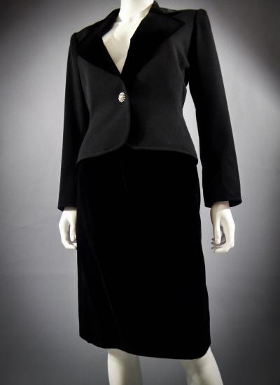 Tuxedo suit skirt Yves Saint Laurent Rive Gauche with jewelry buttons. Skirt and lapel of jacket in black silk velvet. Straight skirt with pockets and side zip. Tuxedo jacket, flared on the hips, with small shoulder pads, in cotton gabardine. Svarowski rhinestone buttons. Note: 2 rhinestone buttons in addition to the reverse of the jacket, which means that the set has never been worn. Label Saint Laurent Rive Gauche Paris Made in France. Excellent condition of color and conservation.