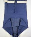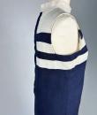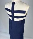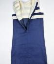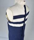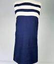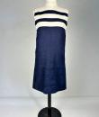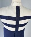 Little navy blue and white linen sailor dress by Yves Saint Laurent Haute Couture numbered 011709 and dating from the 1966-1967 period. Short, straight, sleeveless dress with a small Mao collar raised to a high waistline effect with navy and white stripes highlighting the bust. Square cut-out at the bottom of the hemline and zip concealed under a tab at the back, made in the same way as the dresses in the Mondrian collection in 1965. Lined in 100% silk pongee in navy for the skirt and cream for the bust, with the famous Yves Saint Laurent Paris Made in France label. Under the label is a very illegible printed satin label stating Kimberley n°II size 10. No flaws. Good colour and condition.
