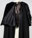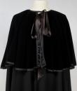 Dramatic Evening black cape by Yves Saint Laurent Rive Gauche dating from the 1980s. Important background in woolen Cashmere (?) sheet of 830 cm span! Shoulders covered with a black silk velvet over-cape tied at the neck with a wide plum colored silk satin ribbon to be gansered elegantly in the manner of 19th century coachmen. Black woven silk ribbon around the cape. Label Saint Laurent Rive Gauche Paris. We will appreciate the contrasts of black materials between the matte of cashmere and the shine of velvet! Absolutely no defects. Excellent condition of color and conservation.