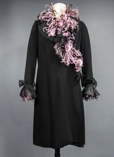 Beautiful wrap dress in black wool crepe and swan feathers by Yves Saint Laurent Haute Couture numbered 29390 Circa 1970. From the wardrobe of Madame Augier, famous owner of the Palais Négresco in Nice. Coat dress with flared cut and no marked waist, long sleeves, crossed on one side and tied with a matching link. Wrap-over neckline and cuffs, both flounced with black muslin. Large bouillonné of pale pink and black swan feathers. Closed lining in black silk taffeta. Label in woven silk indicating Yves Saint Laurent Paris 29390. No flaw, little worn. Very good condition of color and conservation.