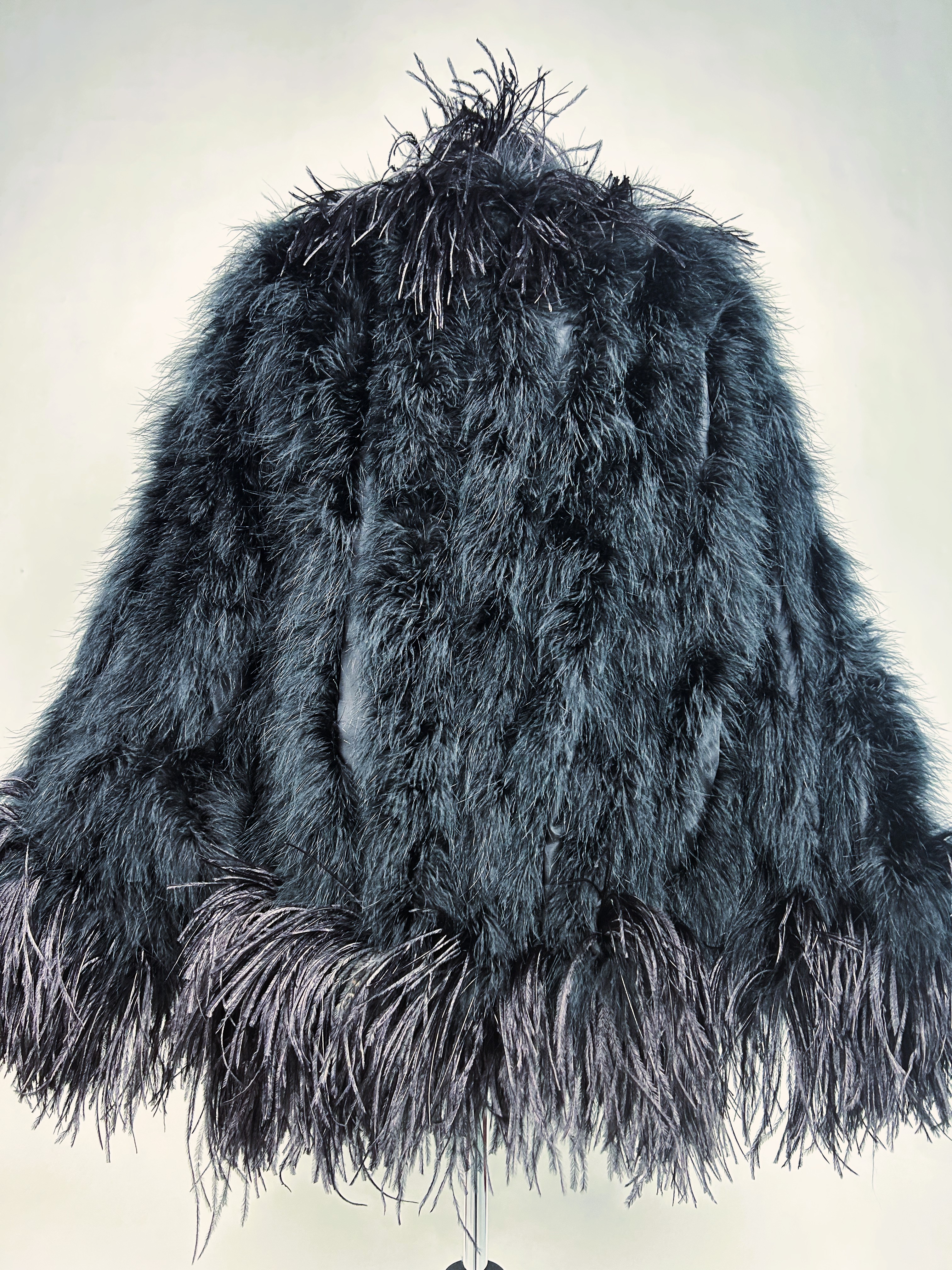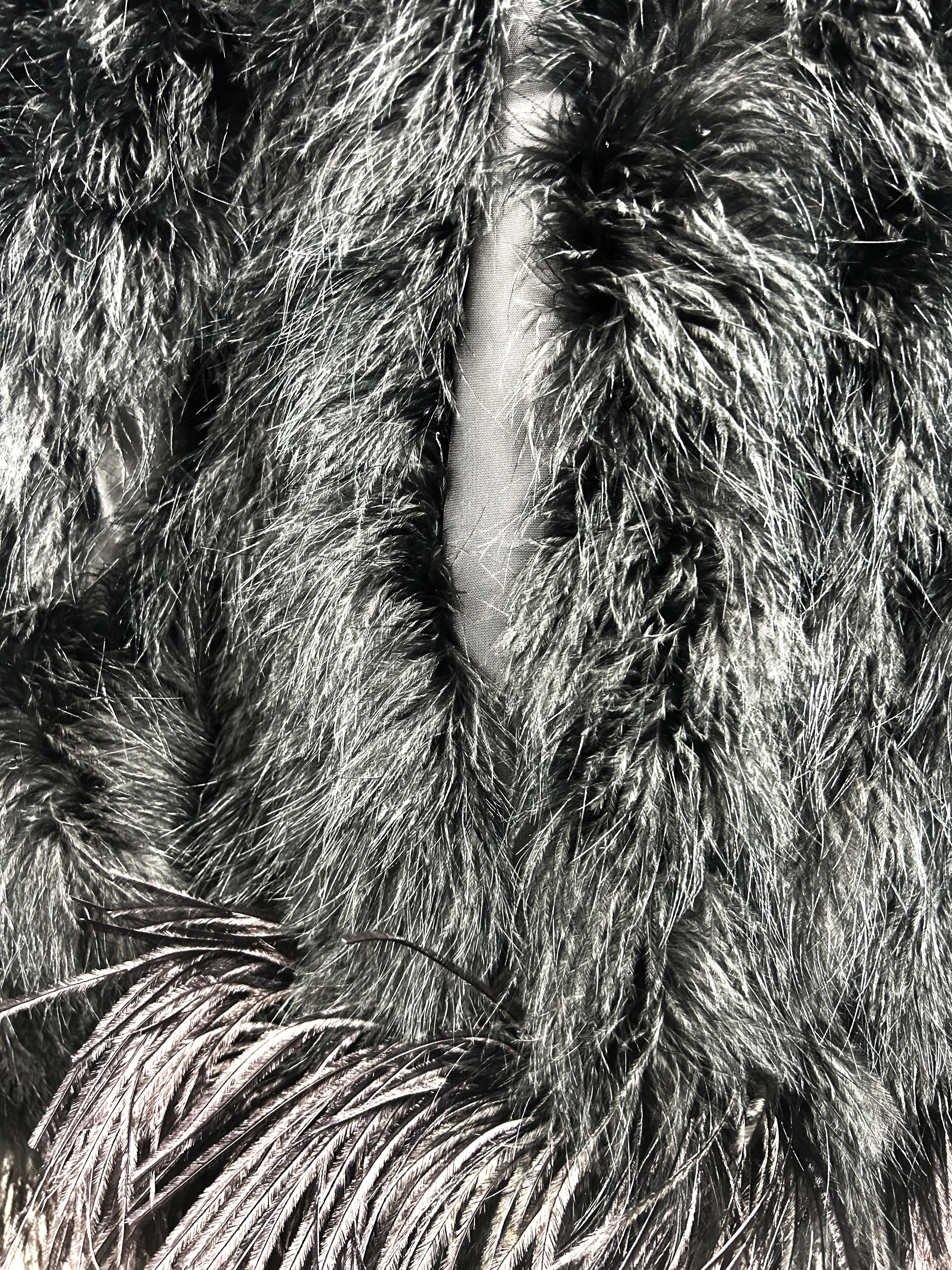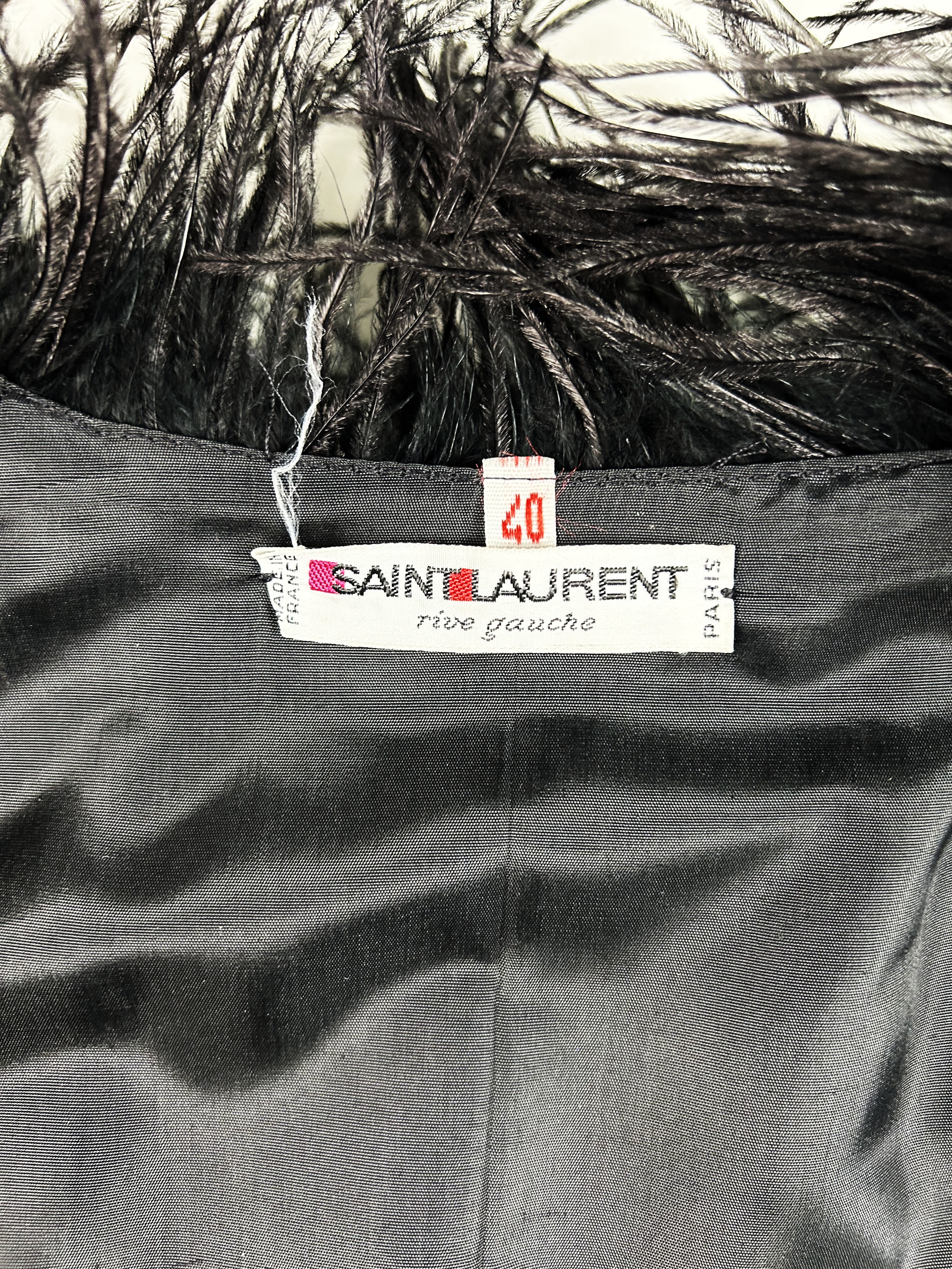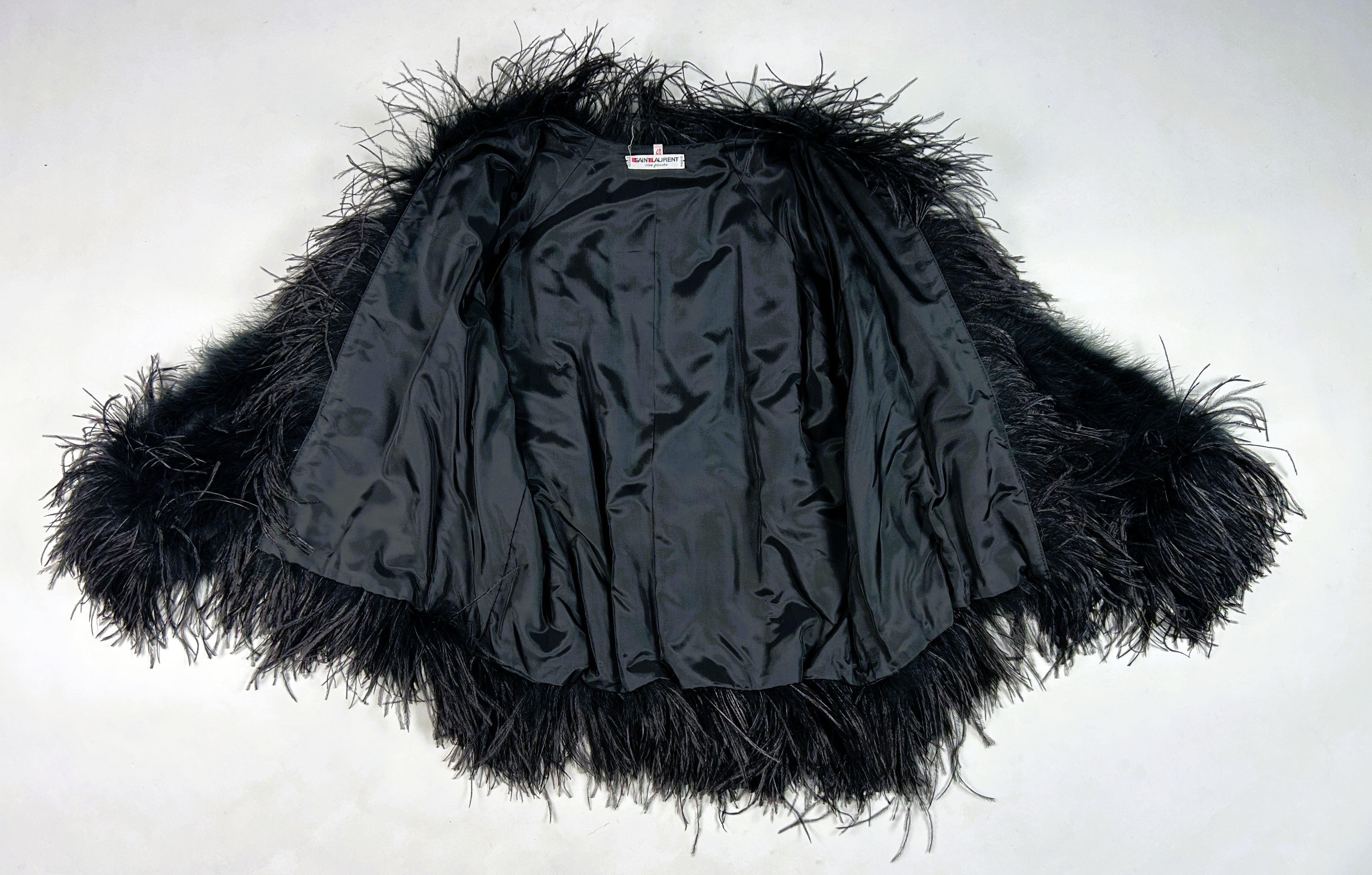An extravagant evening coat by Yves Saint Laurent Rive Gauche, dating from the early 1980s. The coat features a black acetate taffeta body, embroidered with vertical bands of black swan feathers. Loose fit, long sleeves, fastens at the front with a hook covered in black trimmings. The collar, hem and cuffs are adorned with longer ostrich feathers in shades of grey and black. Fully lined in black acetate taffeta and features a white label with black lettering bearing the logo ‘Made in France, Saint Laurent Rive Gauche, Paris’, size 40. No flaws to report. Excellent condition in terms of colour and preservation.
