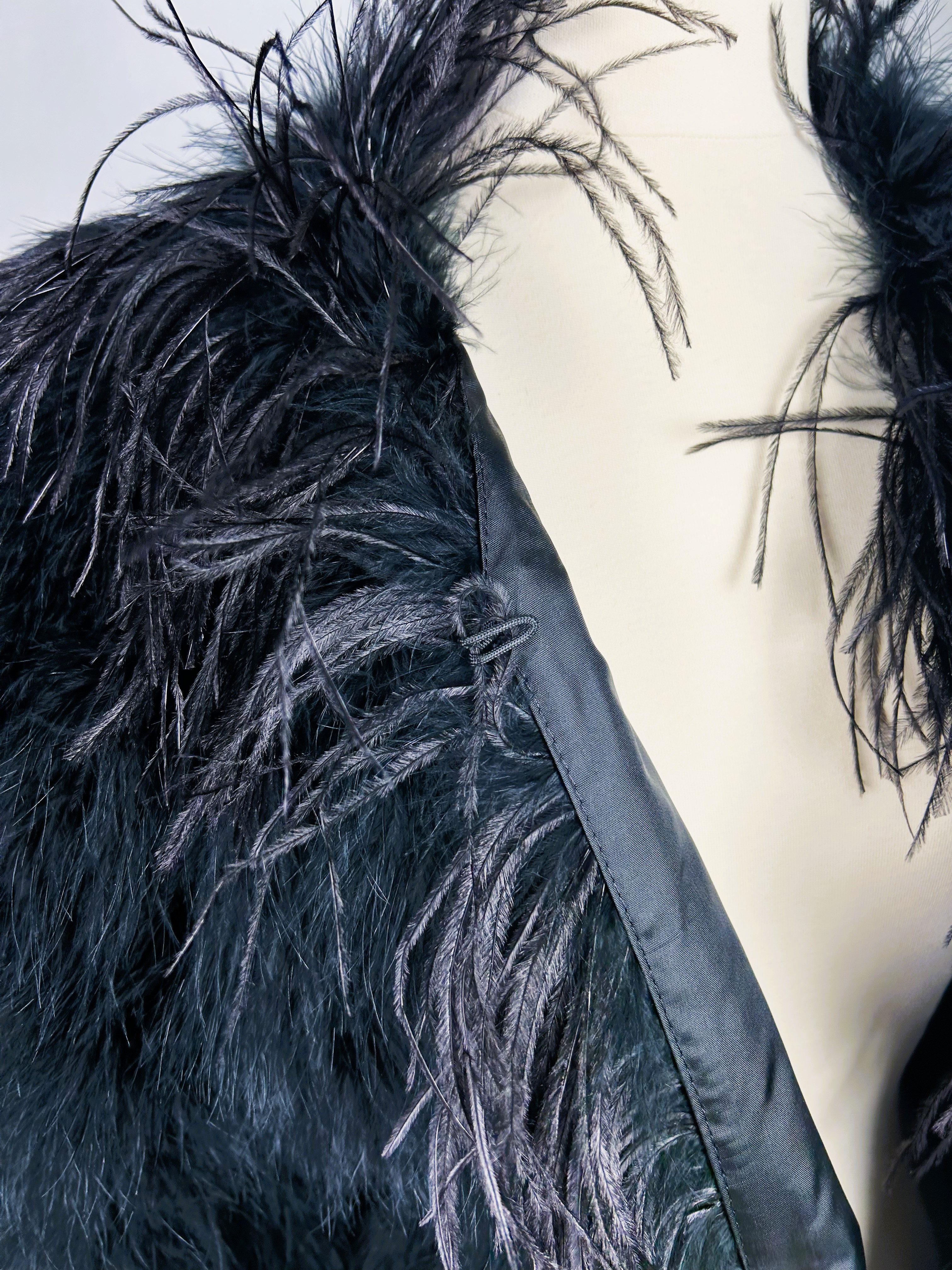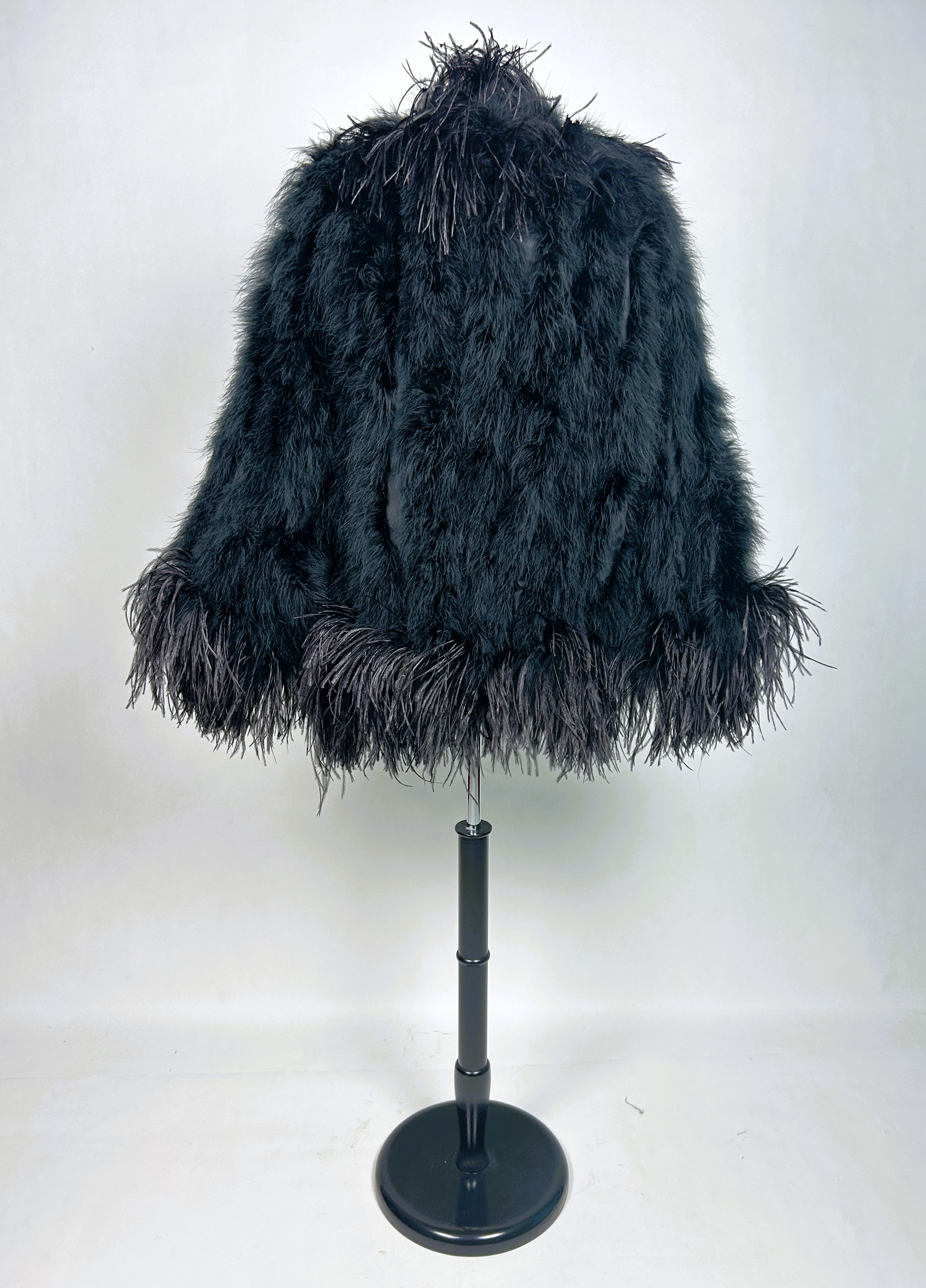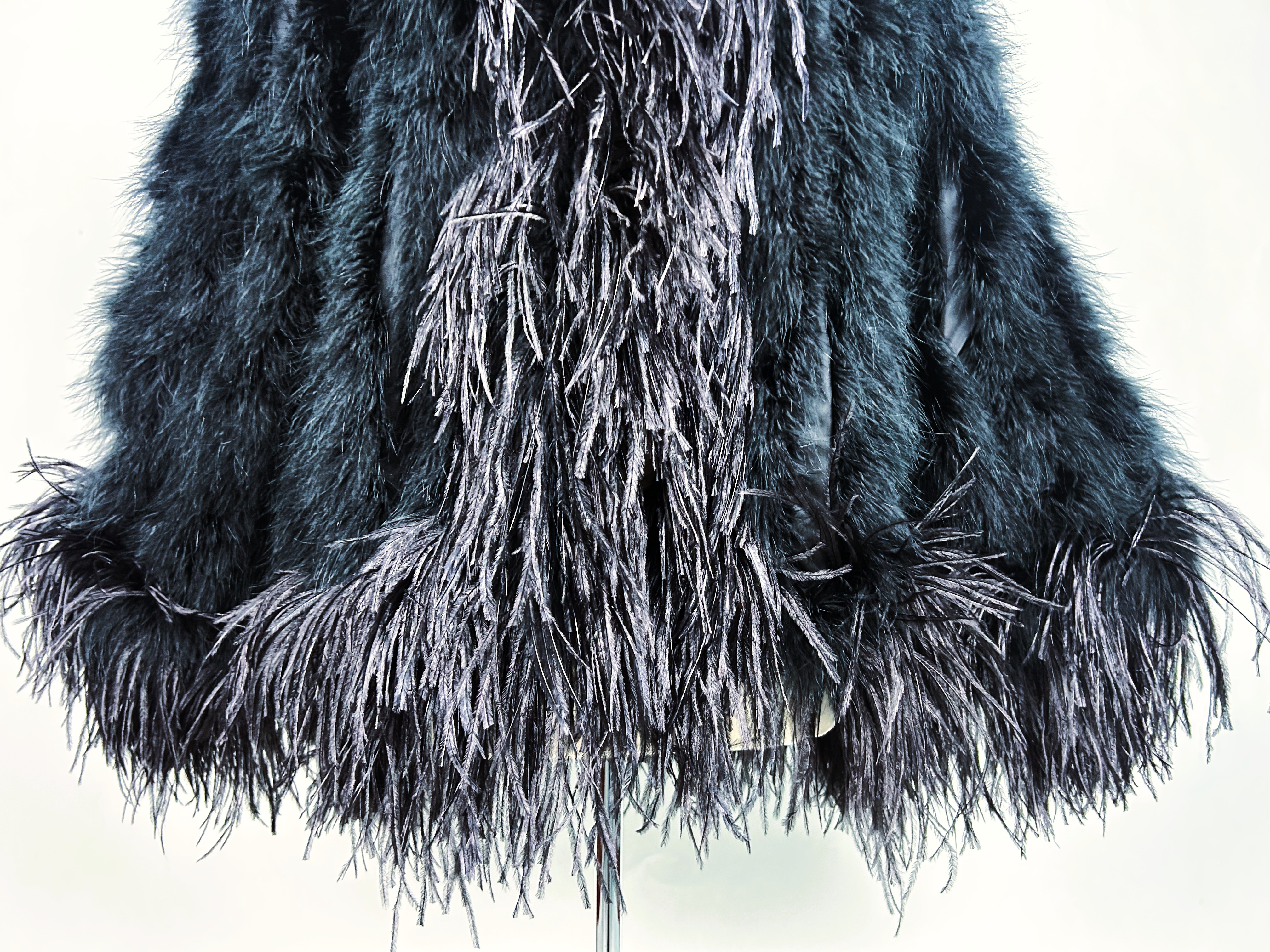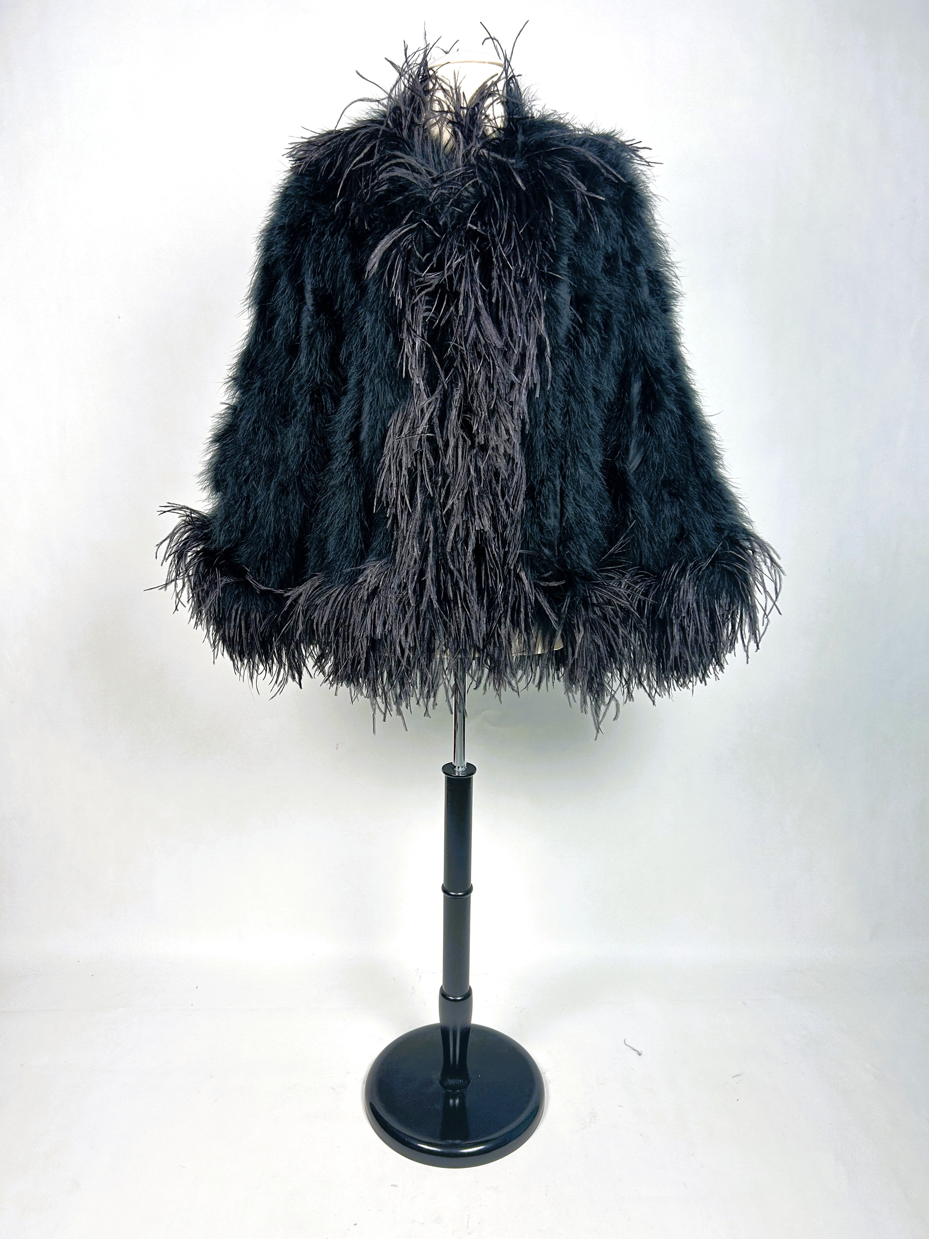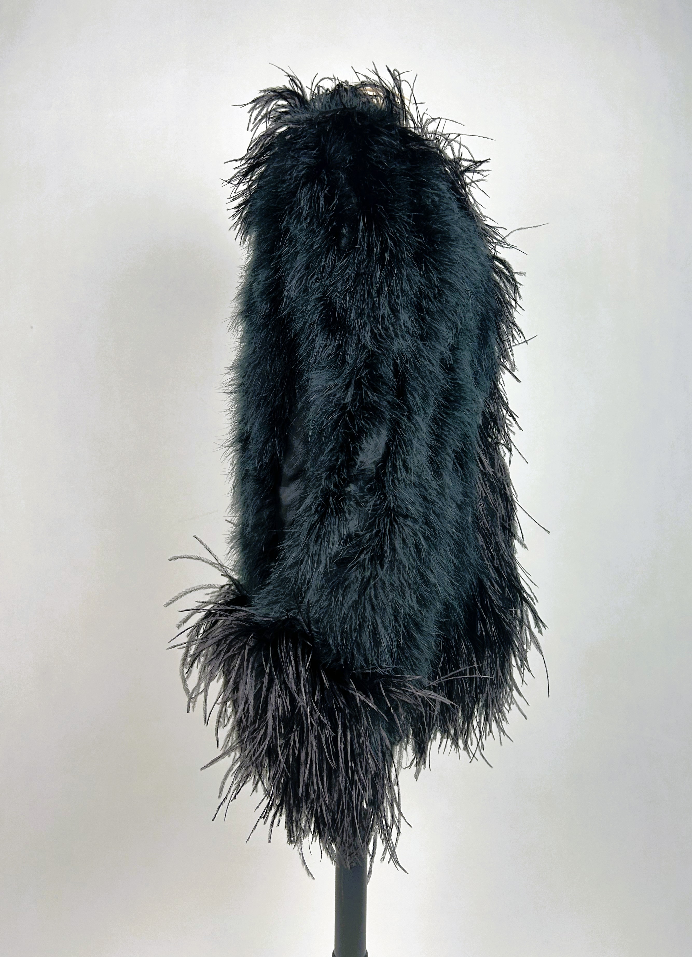 An extravagant evening coat by Yves Saint Laurent Rive Gauche, dating from the early 1980s. The coat features a black acetate taffeta body, embroidered with vertical bands of black swan feathers. Loose fit, long sleeves, fastens at the front with a hook covered in black trimmings. The collar, hem and cuffs are adorned with longer ostrich feathers in shades of grey and black. Fully lined in black acetate taffeta and features a white label with black lettering bearing the logo ‘Made in France, Saint Laurent Rive Gauche, Paris’, size 40. No flaws to report. Excellent condition in terms of colour and preservation.