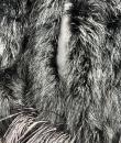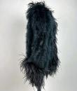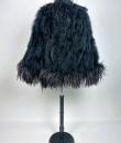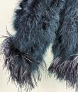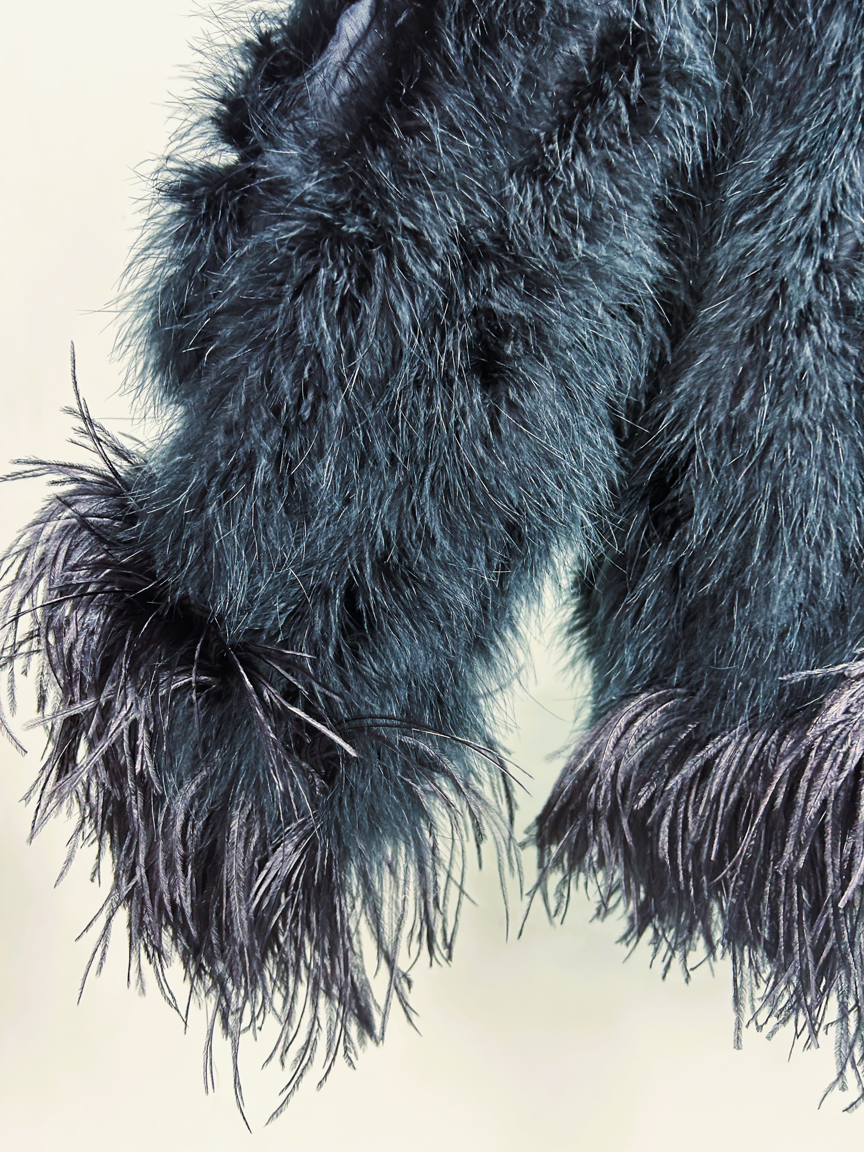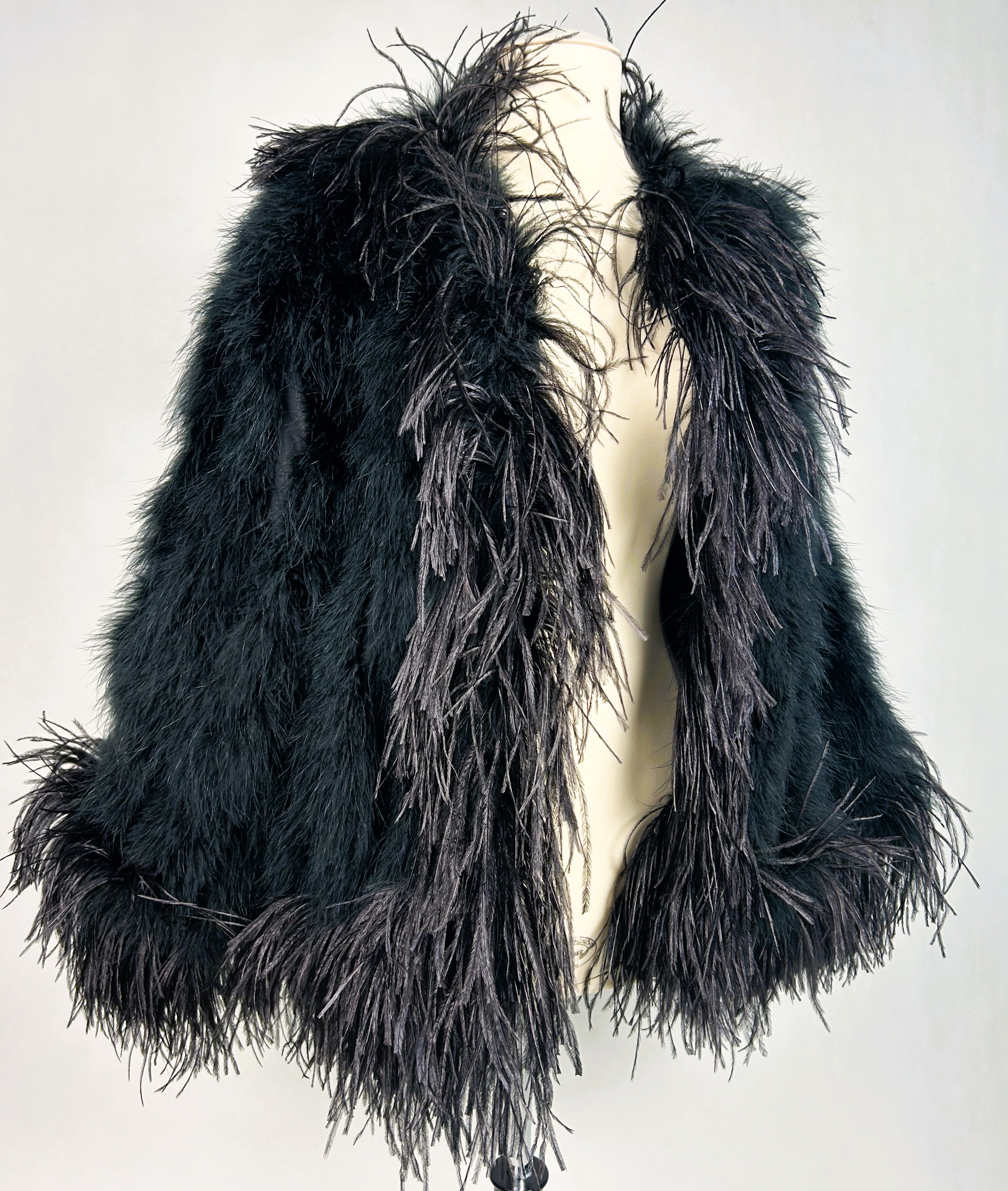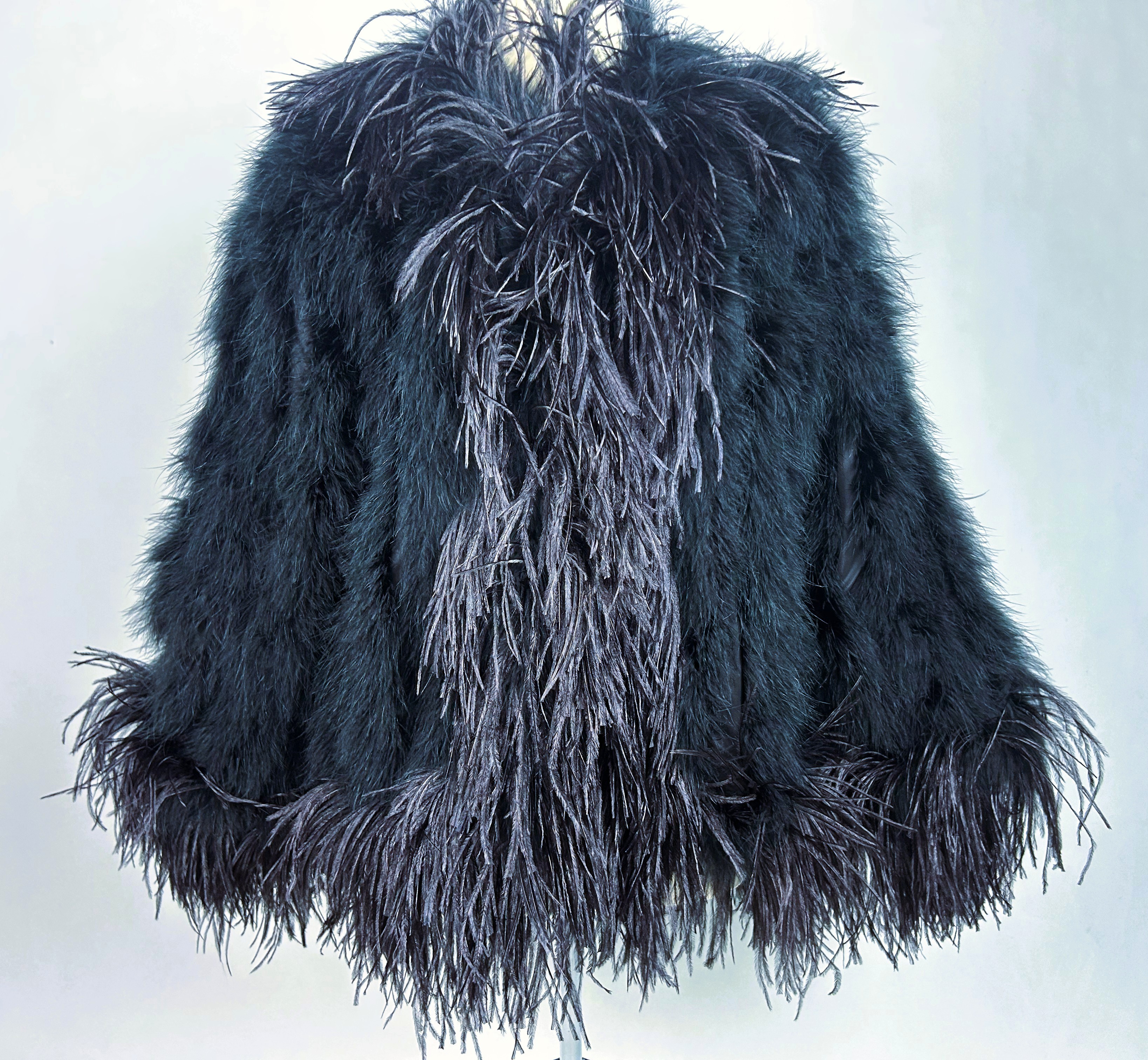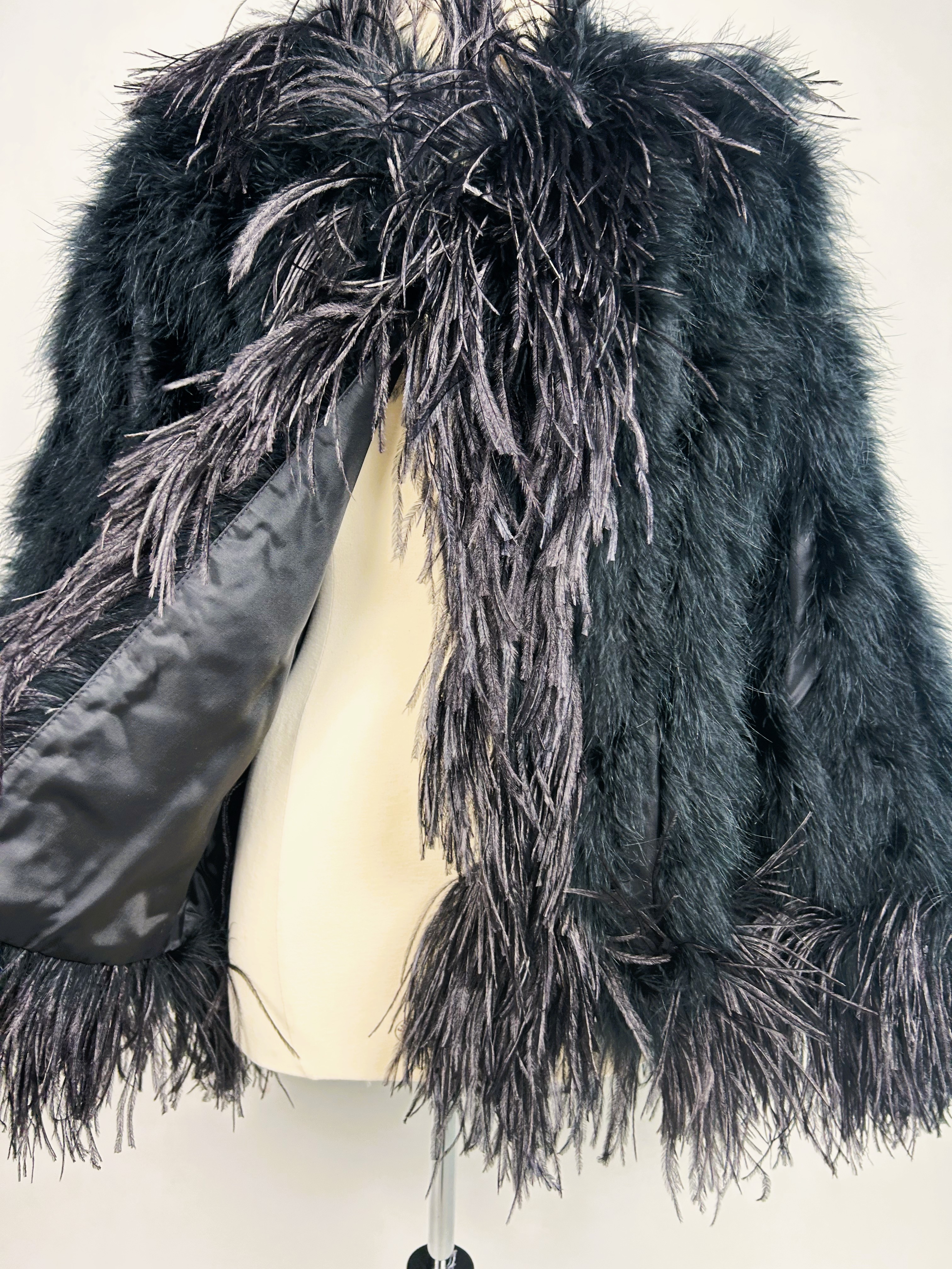 An extravagant evening coat by Yves Saint Laurent Rive Gauche, dating from the early 1980s. The coat features a black acetate taffeta body, embroidered with vertical bands of black swan feathers. Loose fit, long sleeves, fastens at the front with a hook covered in black trimmings. The collar, hem and cuffs are adorned with longer ostrich feathers in shades of grey and black. Fully lined in black acetate taffeta and features a white label with black lettering bearing the logo ‘Made in France, Saint Laurent Rive Gauche, Paris’, size 40. No flaws to report. Excellent condition in terms of colour and preservation.