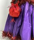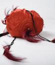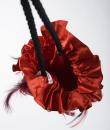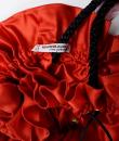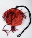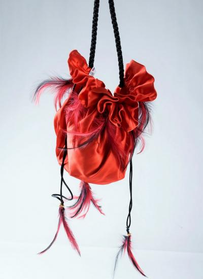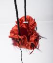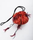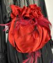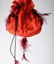 Small purse, bag or reticule for evening wear to match the blouse and skirt set, posted separately. In the tradition of Yves Saint Laurent's Opéra Ballet Russe collection. Purse in red silk satin, tightened by a black silk passementerie cord. Jewellery charms in red and black partridge feathers. Yves Saint Laurent Rive Gauche Paris label inside the bag. No flaws. Very good colour and condition.