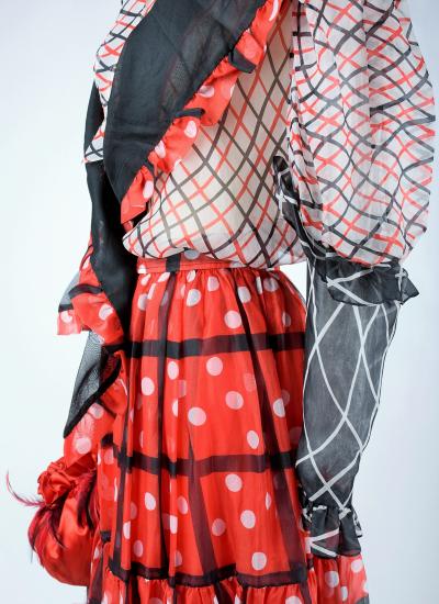 poignets simulant des gants. Jupe longue et ample à grand fond et à deux niveaux, sous jupe en taffetas. Châle fichu assorti (la bourse visible ne fait pas parti de cette vente). Cet ensemble historique est dans la lignée de la Collection Ballets Russes (1976) et de l'inspiration paysanne déclinée les années suivantes. Pas de défaut. Très bel état de couleurs et de conservation.