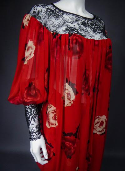 Ensemble blouse et jupe Yves Saint Laurent Haute Couture en crêpe de soie rouge et impression de roses rouges, noires et blanches datant de la fin des années 1980. Ensemble non griffé. Crêpe de soie de la Maison Abraham. Coupe fluide de la blouse à manches bouffantes resserées au niveau du coude par des mitaines en dentelle de Calais noire, fermées par zip et ornées de boutons facettés noirs. Col rond en dentelle noire laissant découvrir la poitrine. Fermeture à crochet au dos du col avec échancrure en forme de goutte. Jupe en pareil, se fermant à l'arrière par crochet et zip, doublée en soie rouge. Non griffée mais pièce haute couture de Yves Saint Laurent. Excellent état de couleur et de conservation.
