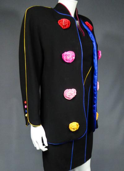 Ensemble robe et veste en crêpe de laine par Emanuel Ungaro Haute Couture Collection 1991/1992. Robe moulante dessinée de passepoils en satin dans les tons rouge, rose bleu et jaune, épaulettes et petites manches raglan. Col Mao à décolleté fendu devant et derrière. Fermeture par Zip dans le dos. Veste assortie ornée de fleurs en velours dans les tons rouge, rose et jaunes. Manches longues et passepoil dans les tons bleu et jaune, larges épaulettes et boutons assortis au niveau des poignets ouverts. Doublure de la robe en nylon noir. Doublure de la veste en satin de soie bleu électrique. Griffe fond blanc graphisme noir Emanuel Ungaro Couture Paris. Bon état de couleur et de conservation.