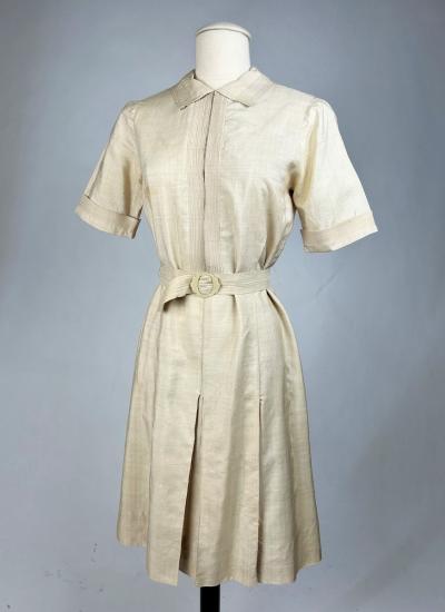 Elégante robe estivale en soie sauvage écrue datant des années 1930-1940, s'inspirant de la sobriété et de la décontraction des coupes de Mademoiselle Chanel. Robe droite à petit col Claudine ras du cou, manches courtes et zip dans le dos. Interessant travail de surpiqûres parrallèles sur le col, le revers des manches et sur le devant formant une silhouette affinée. Ceinture à passe à boucle en bakélite crème. Jupe à plis creux s'évasant dans le bas. A noter une très discrète auréole sur le bustier, pas d'autre défaut, peu ou pas porté. Très bel état de couleur et de conservation.