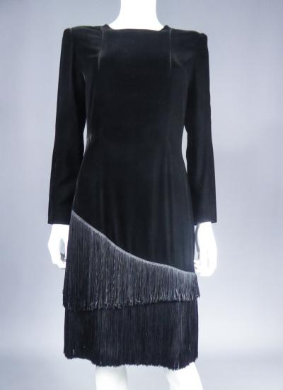 Petite robe noire Haute Couture de cocktail ou du soir de Jules-François Crahay, directeur de la Maison Lanvin jusqu'en 1988. Robe droite à épaulettes et manches longues en panne de velours noir ornée de franges de soie asymétriques sur la jupe. Doublure en satin noir et griffe au logo de la célèbre Maison Lanvin. Zip dans le dos. Très bel état de couleur et de conservation.