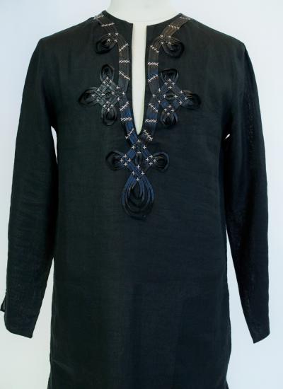 Belle blouse orientaliste en lin noir brodé de Jean-Paul Gaultier Monsieur datant des années 2000. Libre inspiration ou clin d'oeil du créateur à la coupe d'une Djellaba ou à la longueur d'une Kurta indienne. Blouse ras du cou fendue sur la poitrine, sur les côtés et aux poignets. Poches fendues sur les côtés. Belle broderies appliquées en lacets de cuir noir soulignés au point de croix de fil de soie blanc. Blouse peu ou pas porté, aucune trace d'utilisation. Excellent état de couleur et de conservation.