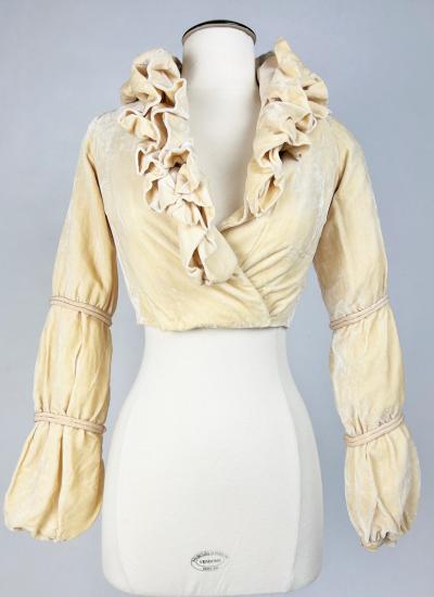 Boléro du soir en panne de velours irisé de couleur crème coquille d'oeuf datant des années 1930, et griffé Paule Haute Couture à Lyon. Coupe cintrée et croisée sur le devant façon cache-coeur à grand col en V bouilloné de velours assortie. Manches longues à la Mameluck, à deux liens de cordons en crêpe beige serrant le bras et terminant en léger bouffant vers le poignet. Doublure en crêpe de soie crème qui comporte des fragilités et des micro déchirures au niveau des manches à l'intérieur. Le velours reste propre malgré de rares micro taches de rouilles de la grosseur d'une tête d'épingle. Pas d'autres défauts à signaler.Etat stable de conservation. Moèle plutôt à exposer.