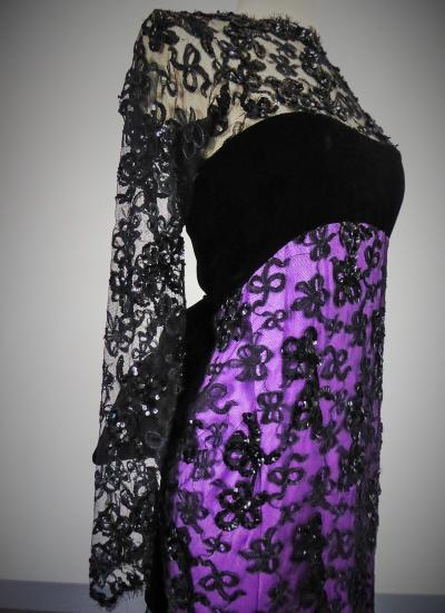 Exceptionnelle Robe de grand soir à traine Yves Saint Laurent Haute Couture Collection 1985. Satin violet Abraham recouvert de dentelle noire de Marescot entièrement brodé de sequins noir. Robe bustier à corset intégré en tulle de coton et baleiné. Ligne à taille haute Empire, manches longues et décolleté en dentelle de Marescot brodé. Poitrine soulignée d'un corset de velours de soie noir en ligne oblique se terminant par un noeud assortie sur les reins. Imposante traine en plissé et bouillonné de dentelle de Marescot Fermeture de la robe par zip et crochet au dos. Griffe fond blanc graphisme noir Yves Saint Laurent Paris Made in France numérotée 59501. Très bon état de couleur et de conservation.
