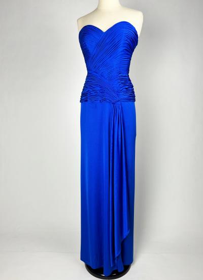 Robe longue pour le soir en jersey lycra bleu électrique de Loris Azzaro Couture et datant des années 1980. Robe moulante en fourreau et grand décolleté plongeant dos nus, fermeture éclair dans le dos. Bustier à plissages croisés assymétriques soulignant les hanches et terminé par une étole le long de la jupe fendue sur le côté. A l'intérieur un soutien gorge intégré et doublure de nylon violet (légères décolorations). Griffe indiquant Loris Azzaro Paris Made in France 42. Le fond en jersey lycra extensible ne comporte ni tache ni trou. Très bel état de couleur et de conservation.