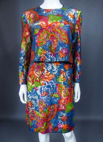 Prototype d'un ensemble deux pièces en lamé bleu, orange, vert, fuschia et argent à motifs floraux. Inspiration Impressionniste évidente en référence de la Collection Van Gogh d'Yves Saint Laurent. Haut à encolure ronde et manches longues revenant sur la jupe, se fermant à l'arrière par un bouton créant un forme de goutte. Jupe taille haute droite à effet portefeuille boutonnée par 3 boutons, un bleu, un orange et un vert, cerclés de métal doré créant une poche sur la côté droit et se fermant par un crochet. Doublure du haut et de la jupe en satin de soie fuschia. Griffe Yves Saint Laurent Rive Gauche Paris Made in France Code Article RV. 439 Série 427 Coloris 11 51% lamé 34% soie 15% métal Code Fab P. 106. Excellent état de couleur et de conservation.