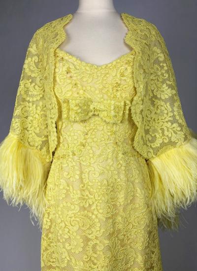 Robe et Cape en dentelle de Calais et plumes d'autruche jaunes de Jacques Heim Haute Couture Circa 1965-1969