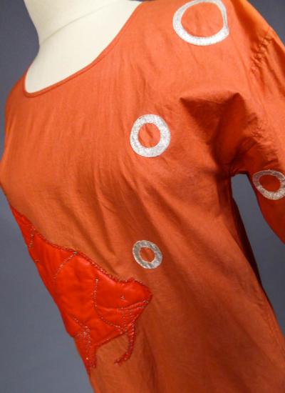 Grand tee shirt en coton orange tissé très fin et appliqué d'un poisson rouge aux coutures dorées et de cercles argentées imitant des bulles. Col rond et manches 3/4, en clin d'oeil aux créations d'Elsa Schiaparelli. Griffe fond blanc graphisme argenté Jean-Charles de Castelbajac KO and CO Made in France Modèle déposé. Excellent état de couleur et de conservation.