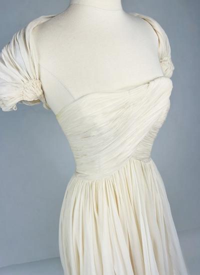 Robe du soir ou de cérémonie en mousseline et crêpe de soie de couleur ivoire et griffée Madeleine Casalino à Paris. Robe glamour, grand décolleté plongeant à dos nu, bustier baleiné à cache coeur plissé et croisé sur la poitrine . Jupe à grand volume finement plissée à la taille et à ligne basculée vers l'arrière, donnant une belle silhouette élancée. Effet vaporeux garanti par la légèreté du crêpe et trois sous jupes également en crêpe. Bustier doublé de nylon blanc à la griffe indiquant Créations Madeleine Casalino Paris. Un délicieux châle boléro plissé et à emmenchures intégrées complète la grace de cette robe. Beau travail de Couture à travail entièrement réalisé à la main. Fermeture par zip dans le dos. La pliure du bustier au niveau des aisselles présente d'infimes et minuscule auréoles jaunâtres, non visible en la portant. Cette robe n'a pas de défaut et est sans tache ni trou. Très bel état de couleur et de conservation.