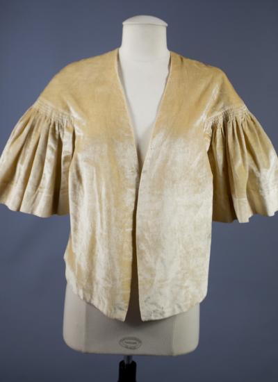 Boléro du soir en panne de velours irisé à effet peau de pêche datant des années 1930/1940, dans le type des réalisation de Jeanne Lanvin à la même période. Coupe évasée, sans col ni boutons ou attaches et doublure en pongé de soie crème à trace de griffe décousues. Imposantes manches chauve-souris à coupe raglan et smocks plissés, donnant une grande amplitude aux mouvements des bras. A noter une tache (1 cm) sur une manche et une micro tache de 0,5 cm dans le dos, toutes deux très discrètes à observer. Sinon propre et très bel état de couleur et de conservation.