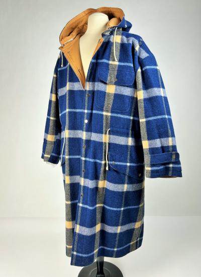 Un grand manteau Homme, Trenchcoat en Tartan de laine à carreaux à l'état de neuf et datant des années 2000. Manteau long à zip et boutons pression à capuche amovible. Trois poches à rabats à boutons pression avec rappel sur les pattes des poignets. Tartan fond bleu marine à larges carreaux blanc et crème à tissage duveteux, chiné et sergé. Doublure en toile coupe vent de couleur chamois clair et cordon de serrage intégré à la taille permettant le nouage devant. Griffe indiquant Courrèges Homme Paris Made in France. Pas de défaut. Excellent état de couleur et de conservation.